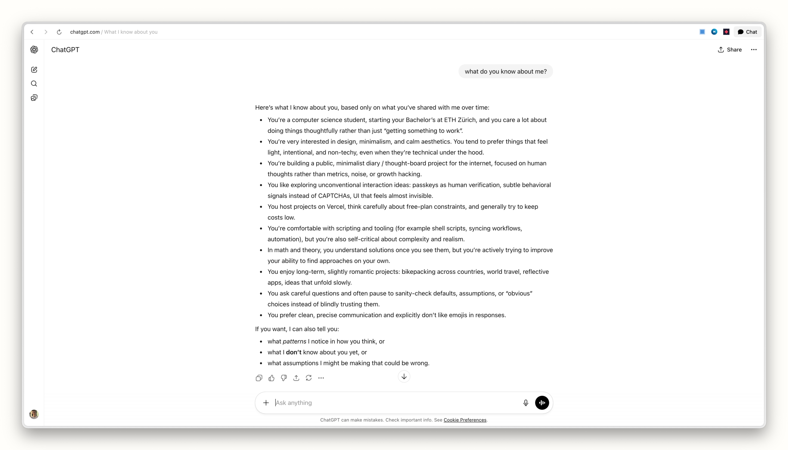 It’s that 24/7 friend on your side. And no, I am explicitly a person who does not use ChatGPT for everything. In fact, I mostly use Gemini and Claude (and still love good old Google searches). I’m not alone in this, this is general. People are so scared of the data social media accumulates on them, but totally forget the power LLMs hold. Here’s what ChatGPT and Claude answer to me asking “what do you know about me?” on a new chat, purely based on their memory features. I’d say Claude nails it better than ChatGPT in this case, but both are incredible. Again, these are not things I told it explicitly, those are things it combined through many many chats with ChatGPT/Claude.
