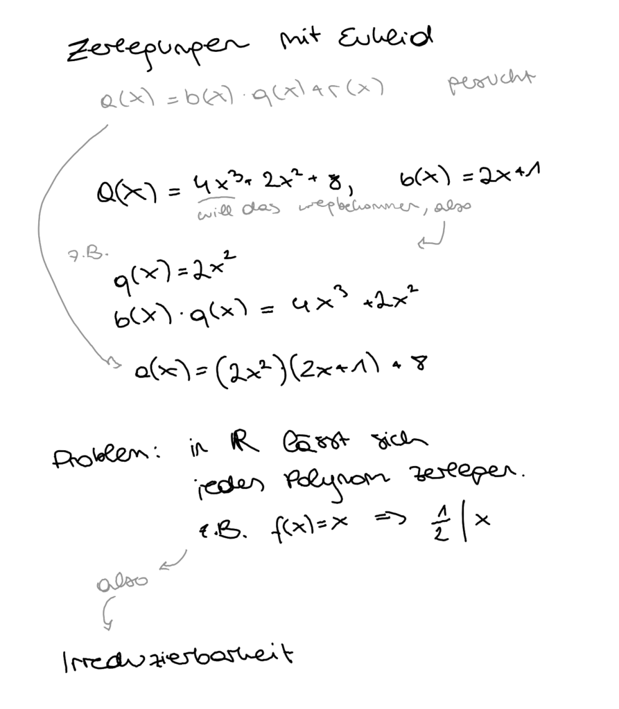 - Bei Grad 1,2,3 gilt: ein Polynom ist irreduzierbar, wenn es keine Nulsltelle im betrachteten Körper hat. Ab Grad 4 gilt das nicht mehr, da wir Faktorisierungen als quadratisch $\times$ quadratisch haben könnten, ohne dass Nullstellen existieren. Grad 3: linear $\times$ quadratisch, also Nullstelle bei linear.