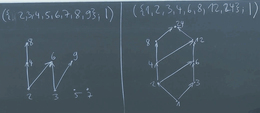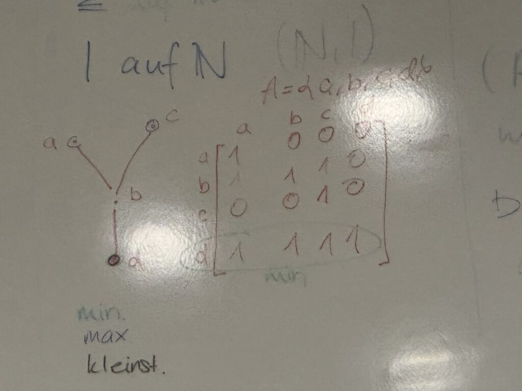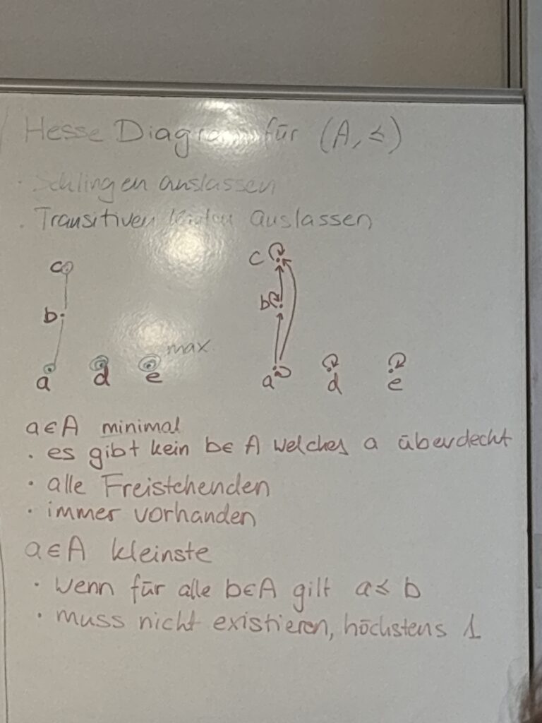 Minimales Element: es gibt kein Element, dass zu dem minimalen Element “zeigt” (mit dem related ist). Es kann mehr als ein minimales Element geben