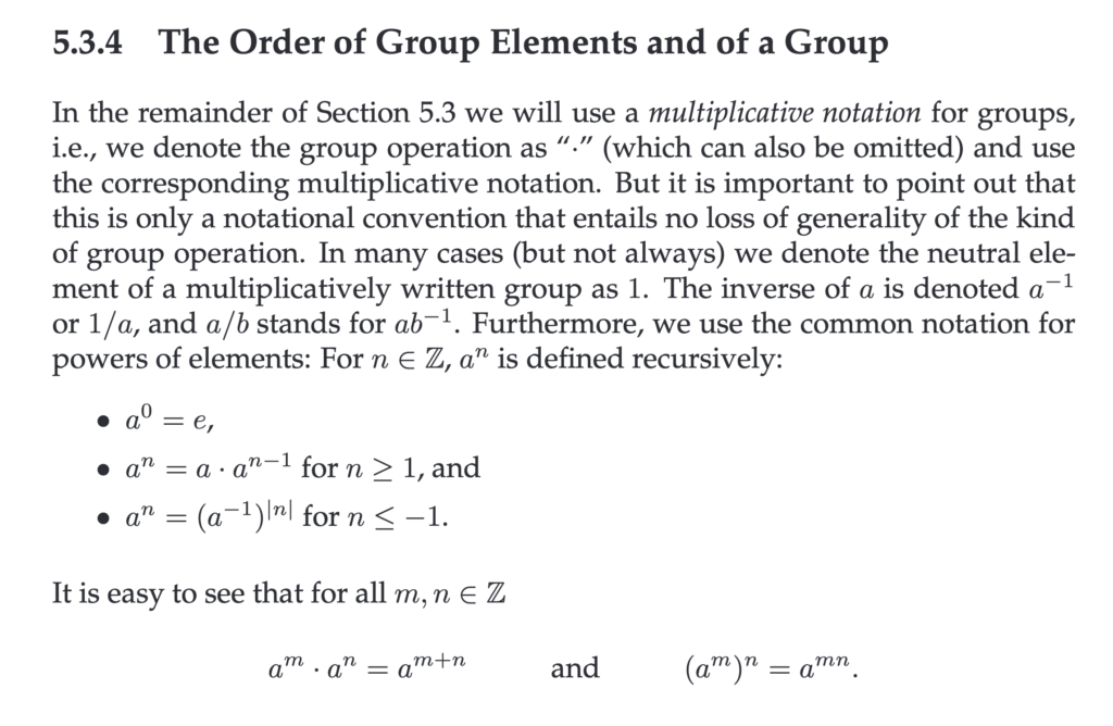 - Vorstellung: wenn ich a wiederholt mit a verknüpfe bis ich das neutrale Element bekomme, dann muss ich ja irgendwann im Kreis laufen, da ich nur endlich viele Elemente habe in der Gruppe. Also z.B. $a$ → $a^2$ → $a^3$ → $a^4$, und z.B. ist $a^2=a^4$.